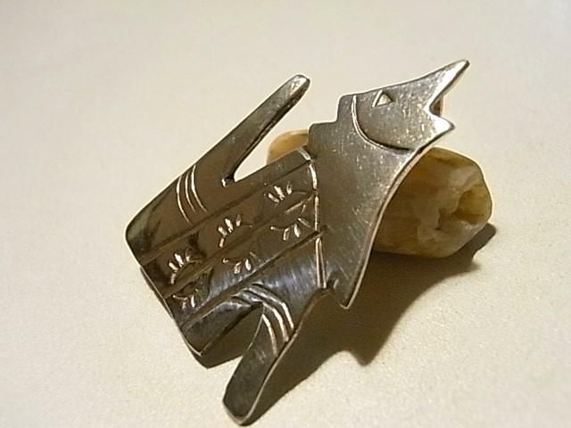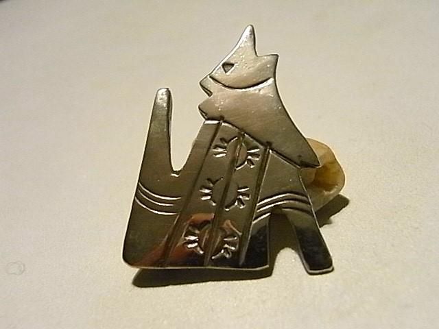 遠吠えするコヨーテorウルフ・狼のシルエットデザインにカットアウトした銀板に、ハンドスタンプで装飾されていて、ナバホジュエリーらしいいい雰囲気です。