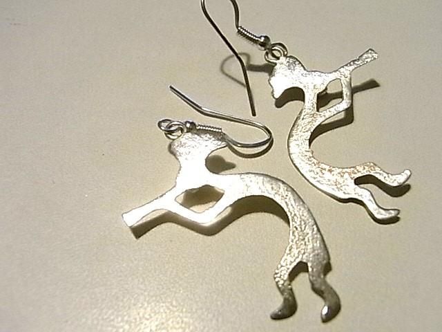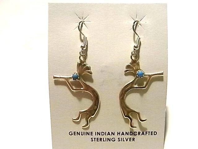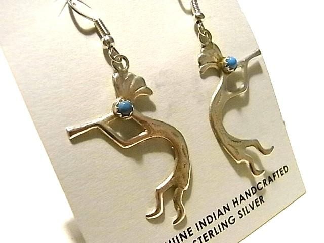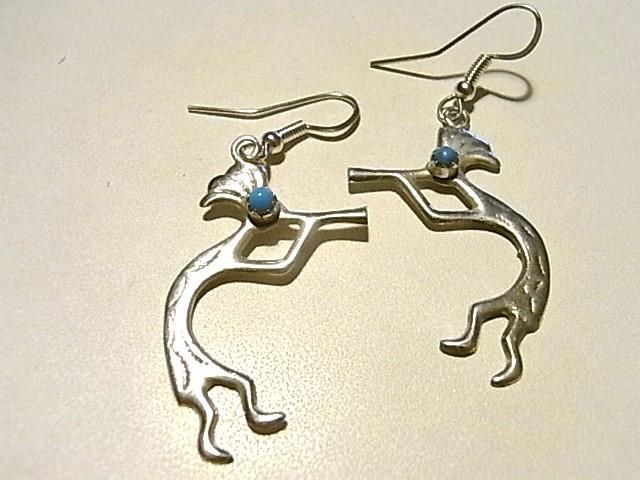 サウスウエストのインディアンジュエリーらしい・・・笛を吹く精霊<KOKOPELLI・ココペリ>のデザインのスイングタイプのピアスです。ワンポイントでターコイズがマウントされているのもかわいいです〜
