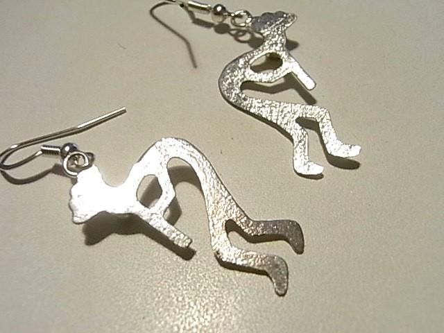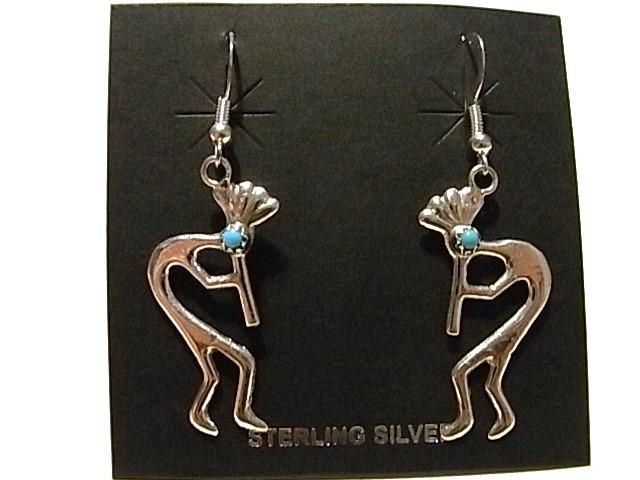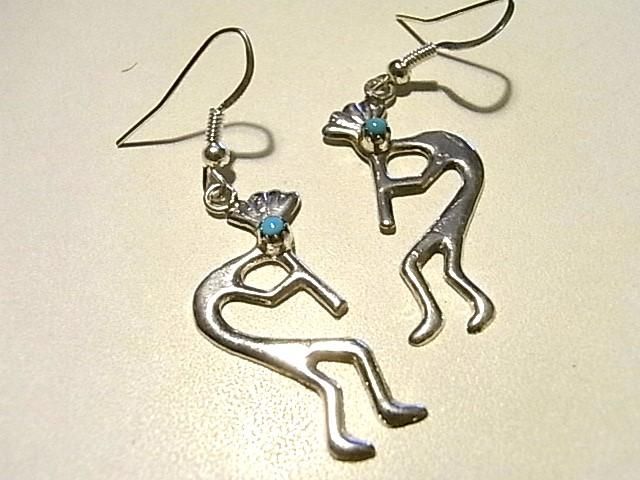 サウスウエストのインディアンジュエリーらしい・・・笛を吹く精霊<KOKOPELLI・ココペリ>のデザインのスイングタイプのピアスです。ワンポイントでターコイズがマウントされているのもかわいいです〜